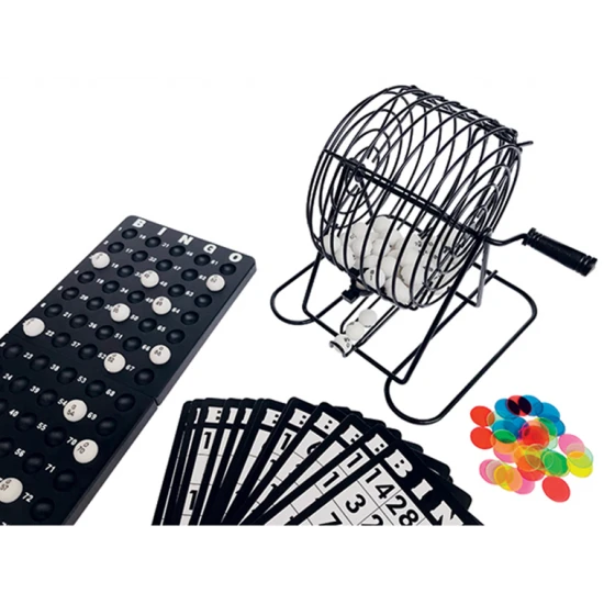 Boulier de bingo avec une carte-maître, 75 balles, 15 cartes de bingo recto-verso et 150 jetons de bingo.