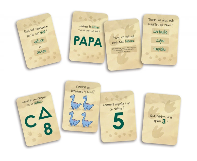 En mission chez les dinosaures a été conçu pour soutenir le développement global de l’enfant de 4 ans à 5 1/2 ans. Dans ce jeu de parcours, l’enfant cherche notamment à reconnaitre des émotions et leurs causes, à décrire à l’oral des situations bizarres vécues par des dinosaures, à reconnaitre les nombres de 0 à 10 et quelques lettres de l’alphabet, ainsi qu’à prendre conscience des sons qui composent les mots.