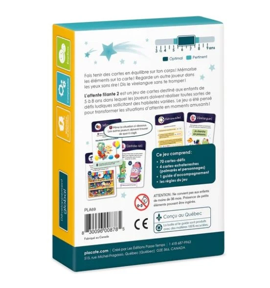 L’attente filante 2 est un jeu de cartes destiné aux enfants de 5 à 8 ans dans lequel les joueurs doivent réaliser toutes sortes de défis ludiques sollicitant des habiletés variées. Le jeu a été pensé pour transformer les situations d’attente en moments amusants!