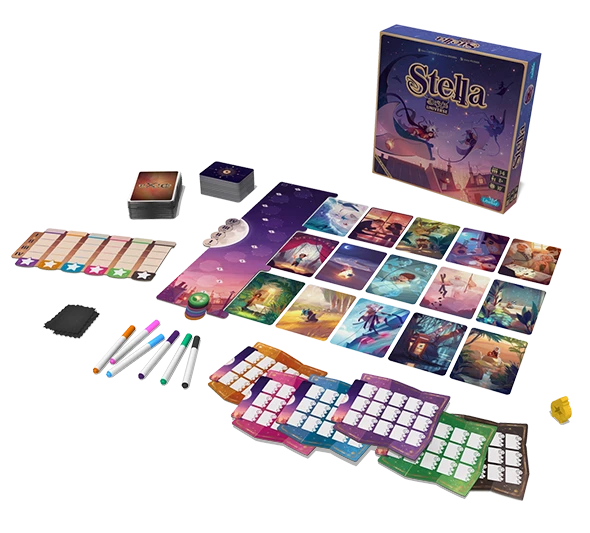 Chasseurs d’étoiles, explorez le ciel et rapportez de la lumière dans votre monde. Stella est un jeu compétitif d’interprétation d’images dans l’univers Dixit. À partir d’un mot, choisissez les mêmes images que les autres joueurs pour remporter la victoire ! Prenez des risques, mais gare à la chute !