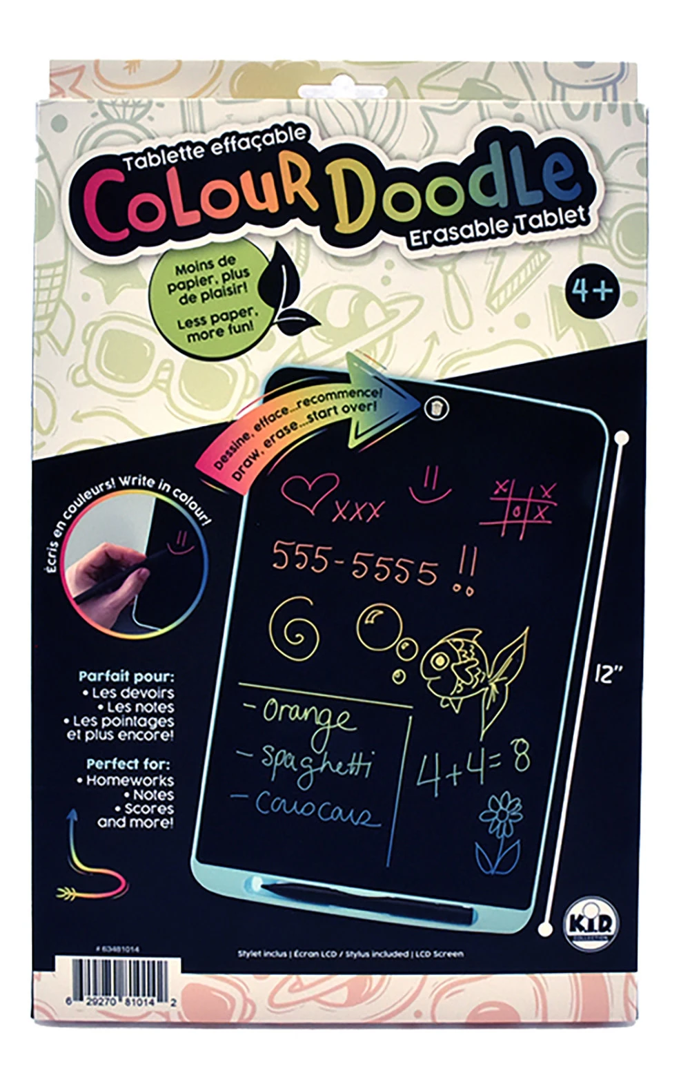 L’accessoire numéro un pour la prise de notes ou les créations artistiques des enfants. L’écriture est en couleurs et s’efface, afin de pouvoir recommencer à l’infini! Elle possède un écran LCD de 12 pouces et le stylet est inclus. Que ce soit pour les messages, les devoirs ou la liste d’épicerie, tout est permis! Donnez une touche de couleurs à vos notes grâce à cette tablette d’écriture effaçable colorée! Elle vous suivra partout: utilisez-la pour vos notes personnelles, les devoirs, les messages ou même pour le calcul des points lors de vos parties de jeux de société!